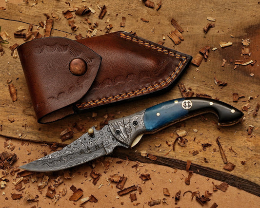 Custom Handmade Damascus Folding Knife Mosaic Pin Brass Pin Brass Pin & Bone Handle - Damascus Bolster Exquisite Artistry
