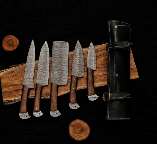 The Black Rose presents the Damascus 5-Piece Chef Knife Set with Leather Roll. Personalized Damascus Steel Chef Set, Hand Forged