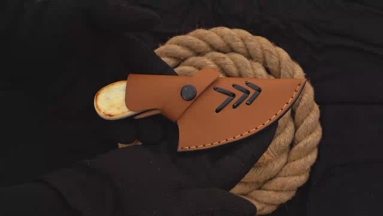 The knife comes with a custom leather sheath designed for both vertical and horizontal carry, ensuring great convenience and versatility in the field.